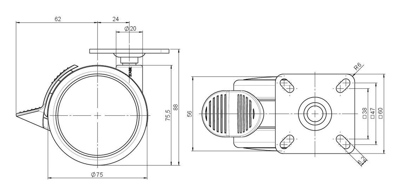 The standard stopper brake ensures that the caster and the piece of furniture will not roll away.